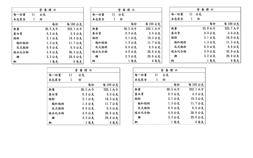 龍舌蘭酒心、洋梨酒心、小米酒酒心、櫻桃酒心、蘭姆酒酒心