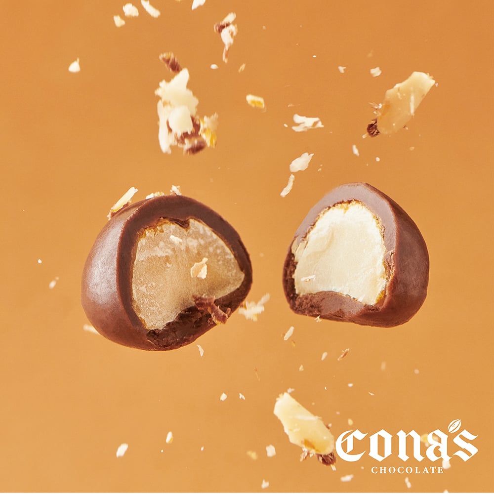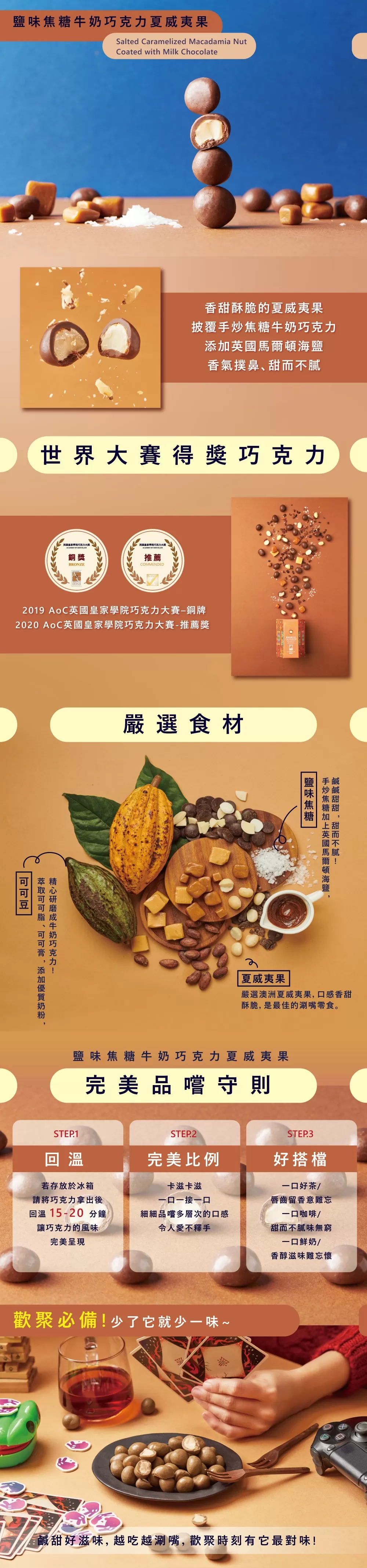 當熬煮後的焦糖加上英國馬爾頓天然海鹽,拌炒在烘烤後的夏威夷果上,再批覆一層迦納產地精選的牛奶巧克力,製作出層次分明的口感、甜而不膩,搭配著無糖熱美式咖啡,最是完美~